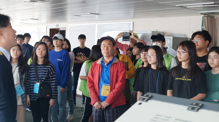 이후 귀국편 배에 오른 학생들을 대상으로 항해실 견학이 진행됐다. 이번 시간에서는 많은 학생들이 관심을 갖고 참가해 총 3번에 걸쳐 진행됐으며, 학생들의 화동훼리의 항해실에서 다양한 이야기를 듣고, 질문을 쏟아냈다.