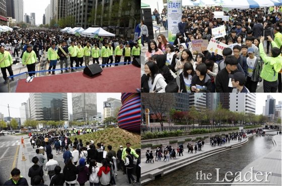 걷기대회의 마지막은 행사의 메인이벤트인 사제동행 걷기대회가 진행됐다. 이날 코스는 청계광장에서 시작해 청계 5가 마전교를 돌아오는 총 4.4Km 코스로 진행됐으며, 사회자의 신호에 맞춰 각자 만들어온 표어를 들고 출발하는 3000여명의 참가자는 모습만으로 장관을 연출했다.